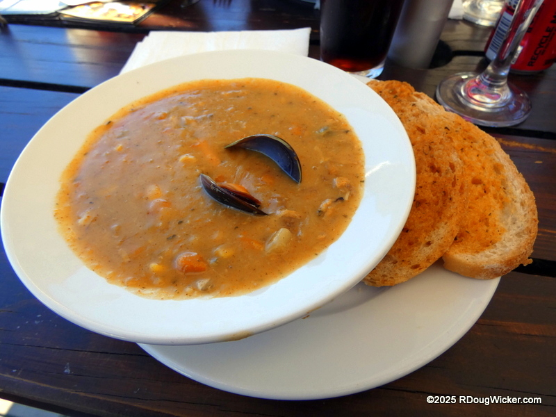 Ursula is a sucker for seafood chowder, and I enjoy it as well. So, we both opted to start with a sampling, which turned out tasty but which doesn’t quite compare to our favorite — Glacier Brewhouse in Anchorage, Alaska. Nevertheless, Quay 4’s was worth the price of admission; R75 ($4.54 USD) gets you this: