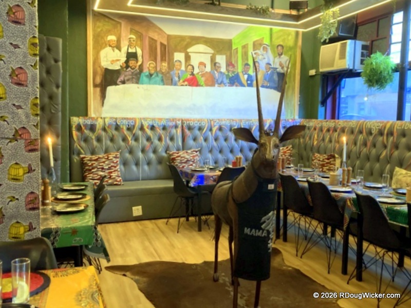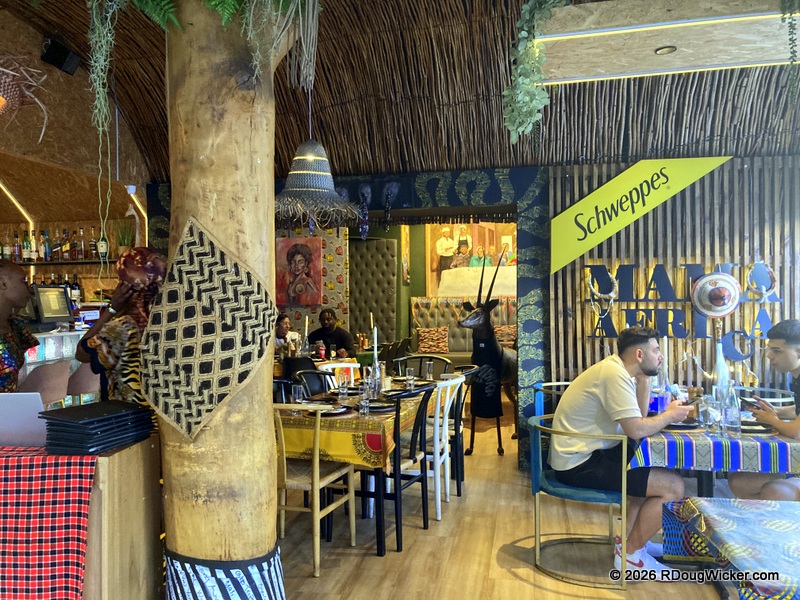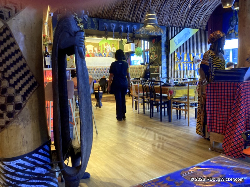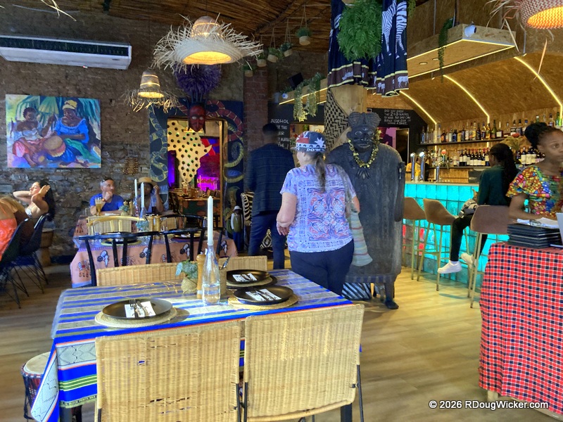 The restaurant decor is charming, the staff friendly and helpful, the food delish, and the menu extensive. The only downside is that it’s on the expensive side. But Mama Africa is well worth at least one trip for dinner. You may even enjoy it enought to go back a second or third time. We almost did, until we stumbled upon today’s second restaurant (more on that shortly). First, before we get to what Ursula and I dined upon, let’s look at the interior: