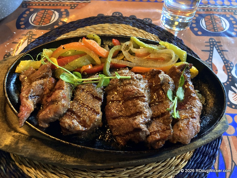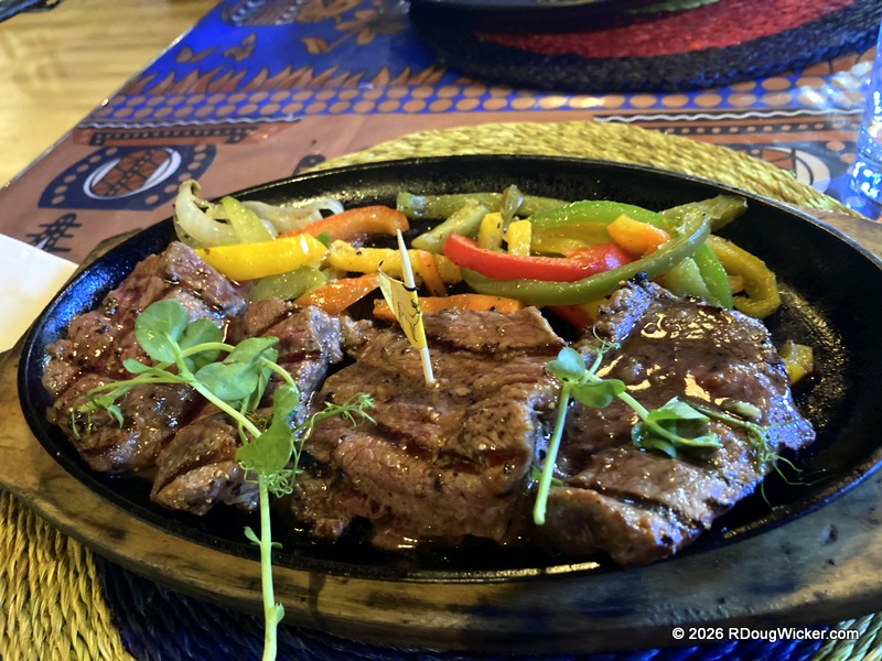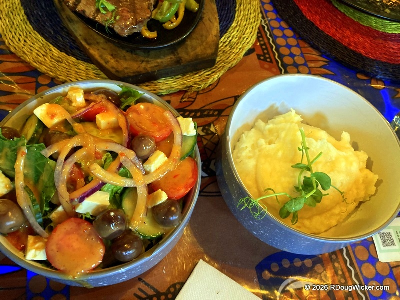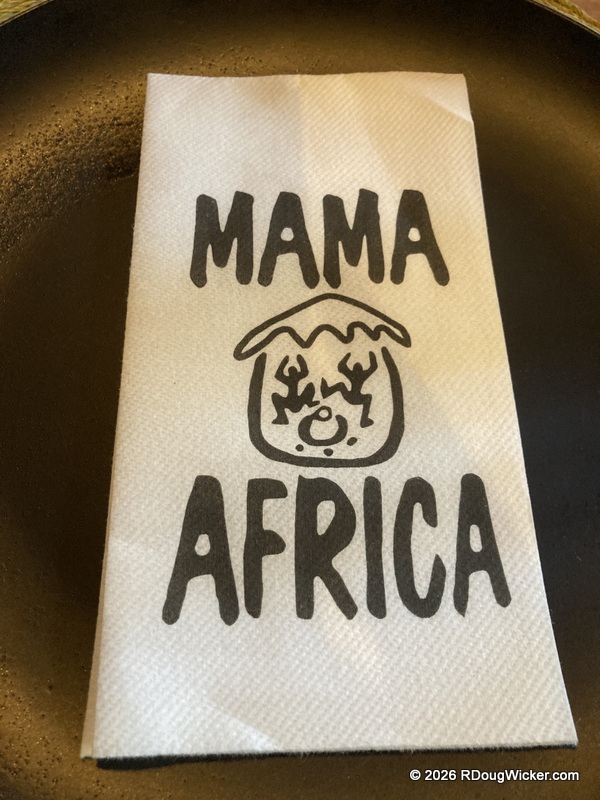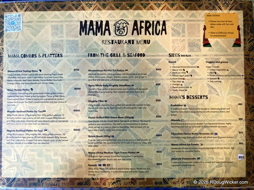 On this, our first visit to Cape Town, South Africa (we’re going again later this year), we dined at several establishments. Two stood out among the rest. So, today I’m presenting a Fun Food Friday two-fer. The first restaurant featured in today’s article is Mama Africa, on the corner of Long Street at Pepper Street. Mama Africa pecializes in native African cuisine with an emphasis on wild game — crocodile, eland, kudu, ostrich, springbok, and even zebra. For the less adventurous, fish, chicken, lamb, and oxtail. Want to see the menu? Here you go: