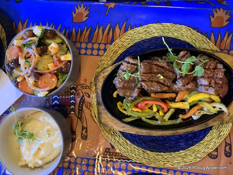 Ursula and I are big believers in trying the local cuisine. As such, we opted for game meat. Ursula’s choice was springbok, a type of antelope. I had the ostrich, as our waitres informed us that it would be a more moist meat. She was right. Ursula’s springbok was tasty, but the meat was dry. We both agreed that the ostrich was the better dish. Now for a look at the food: