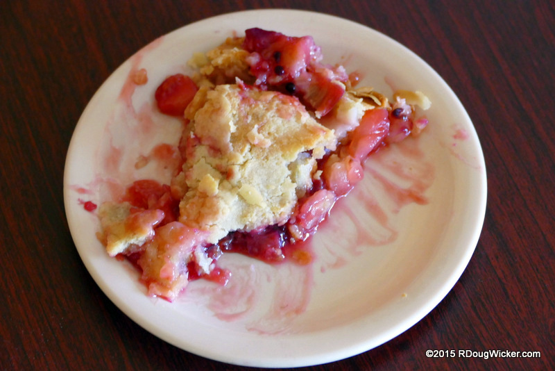 Dessert on the other hand was an incredibly delectable surprise. On the menu this day were two — strawberry shortcake (which I defy anyone to screw up) and fruit pie. As pie requires a culinary sophistication to it, this is what we chose. Our slice took a while to arrive, but that’s because it came to us still piping hot and fresh from the oven. The crust was a flaky affair that far too few bakers properly master. Not so here. The filling was definitely a homemade concoction of apple and various berries perfectly proportioned and not overly sweet as one usually experiences with restaurant pies. You’ll have to excuse the photo of this dish, but the pie was so appetizing that Ursula and I started to dig in before I remembered to photograph it.