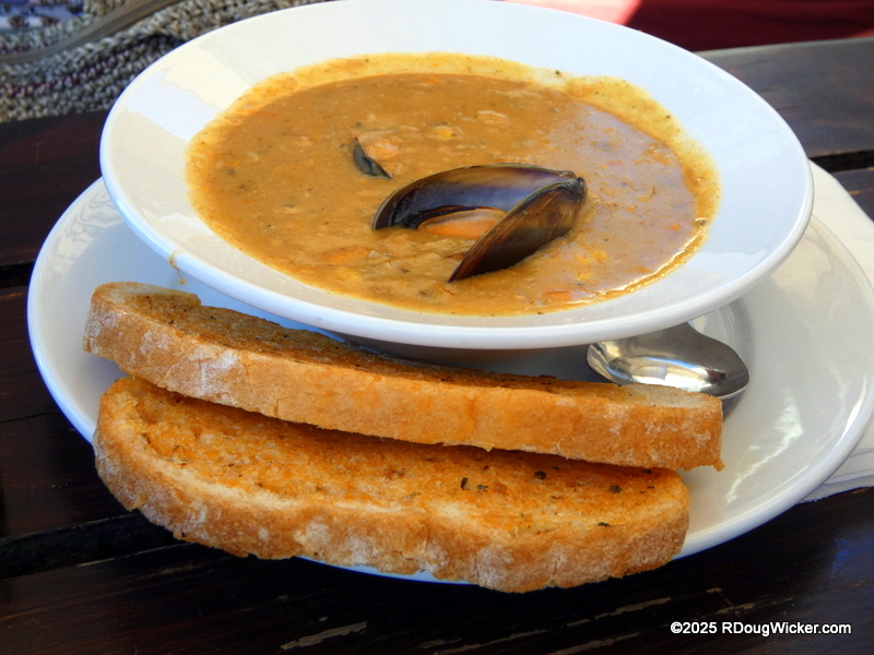 Ursula is a sucker for seafood chowder, and I enjoy it as well. So, we both opted to start with a sampling, which turned out tasty but which doesn’t quite compare to our favorite — Glacier Brewhouse in Anchorage, Alaska. Nevertheless, Quay 4’s was worth the price of admission; R75 ($4.54 USD) gets you this: