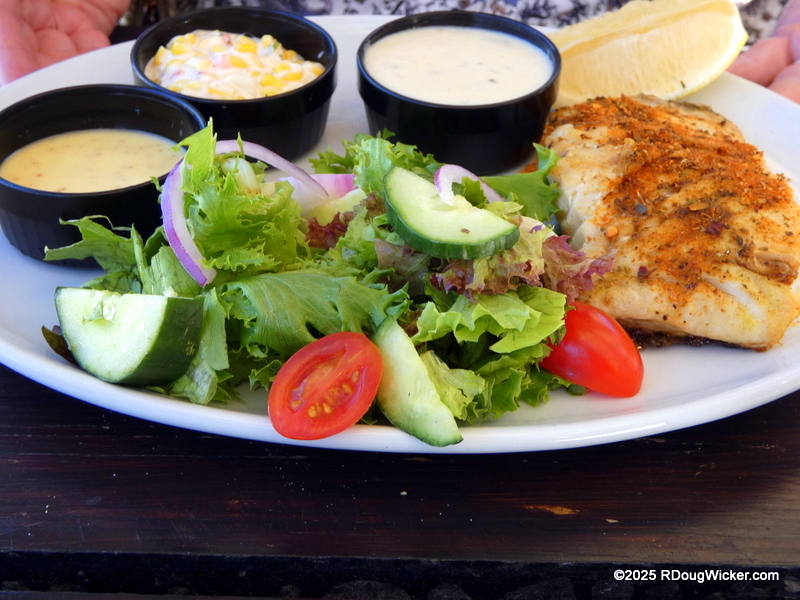 For our mains, Ursula opted for this tasty piece of fish, for which she was given a choice of seasonings (if I recall correctly, she went for a cajun flavor), and a salad with ranch dressing: