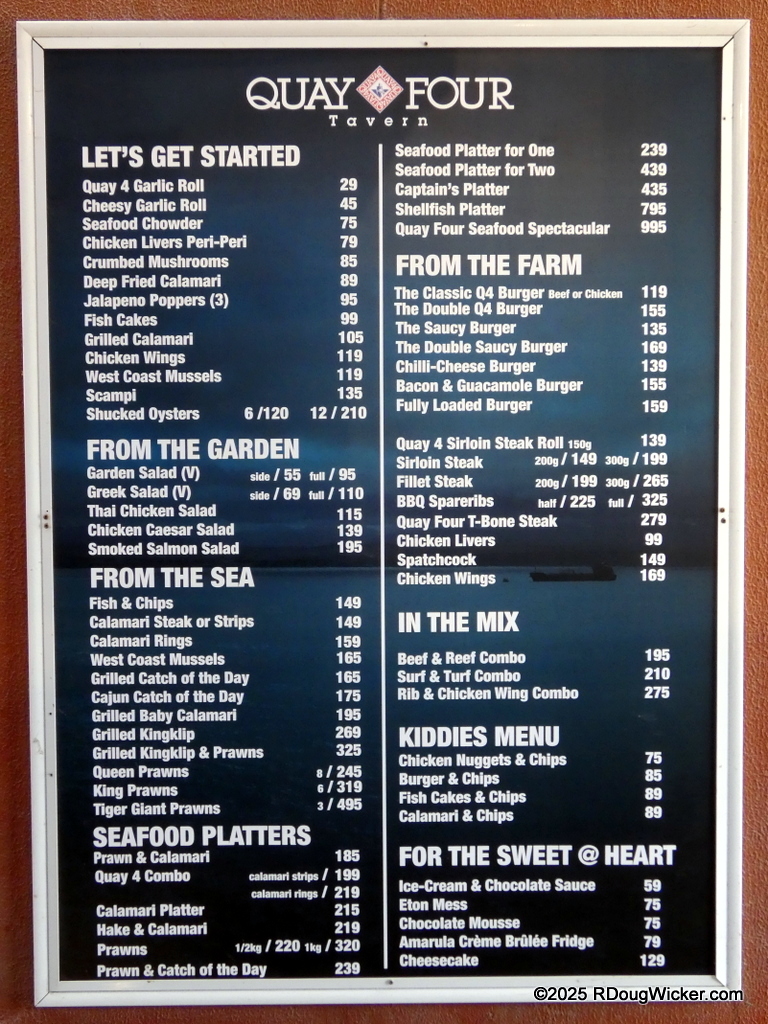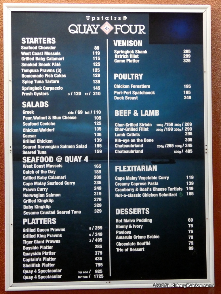 You’ll even pass by a poster showing off Quay 4’s daily specials. And whereas R149 (South African Rand) may sound steep, that works out to just over $9.00 USD: