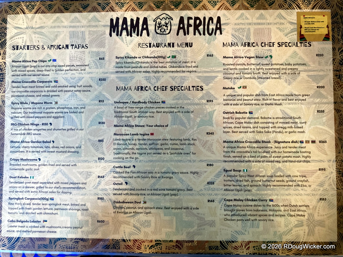 On this, our first visit to Cape Town, South Africa (we’re going again later this year), we dined at several establishments. Two stood out among the rest. So, today I’m presenting a Fun Food Friday two-fer. The first restaurant featured in today’s article is Mama Africa, on the corner of Long Street at Pepper Street. Mama Africa pecializes in native African cuisine with an emphasis on wild game — crocodile, eland, kudu, ostrich, springbok, and even zebra. For the less adventurous, fish, chicken, lamb, and oxtail. Want to see the menu? Here you go: