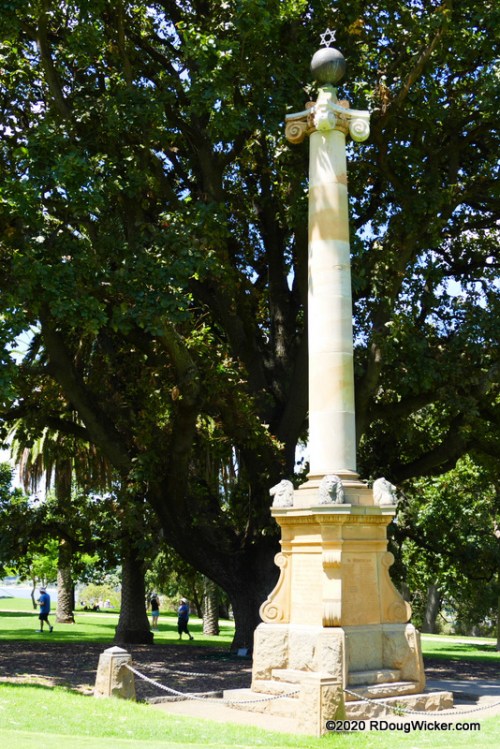 There is however another memorial, much larger. This is the State War Memorial atop Mount Eliza, and it is from here that one enjoys the overlook of Perth and Perth Water (a portion of Swan River). At this site is a 59-foot/18-meter tall Cenotaph: