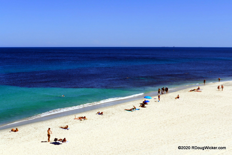 Beginning in North Fremantle and extending northward are a series of beautiful white sand beaches — Sand Tracks Beach, Coast Port Beach, Leighton Beach, Mosman Beach, an onward to today’s photo stop. Today we’re visiting Cottesloe Beach, in the Town of Cottesloe.
