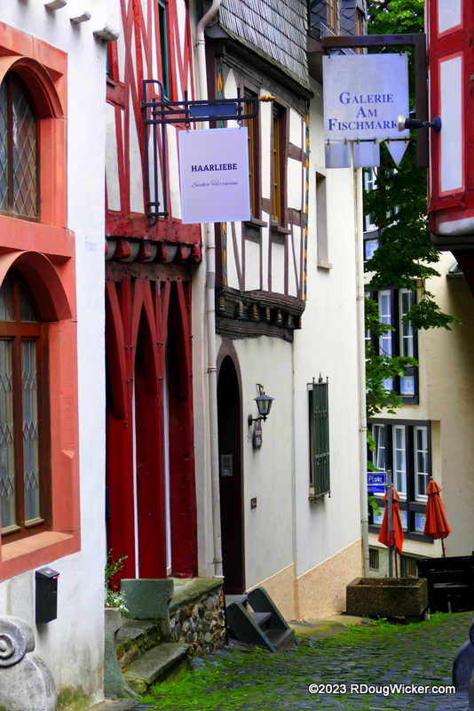 Limburg, as you may have guessed by now, lies along the river Lahn, a tributary of the Rhine. Hence the name: Limburg an der Lahn. When you come for your visit, make sure you have spare camera batteries and plenty of memory cards. You’ll need it. We parked our car in the garage at the east end of Sackgasse, next to the Woolworth’s, and set out eastbound on foot. It was only a matter of yards/meters before we got our first glimpse of the old town portion of Limburg.