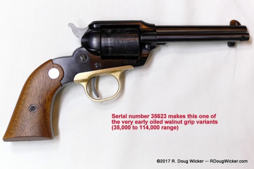Considering that the box and manual added about $75 to the value of the “Alpha Cat”, I figure I got are really good deal on this later oiled walnut Ruger with the “aftermarket” grips. Well, it turns out those oiled-walnut grips are factory, and that this particular example is one of the first ones to come out of the factory that way. Oiled walnut grips were used starting at serial number 35000 through the end of 1st issue production. This Bearcat is number 35623, meaning only 623 Bearcats with oiled walnut grips preceded it out of the Ruger factory door. It’s also one of only about 15,000 Bearcats in the 35000-to-114000 serial number range that retained the original steel ejector housing before Ruger switched to aluminum. Yes, I checked that with a magnet. It’s steel.