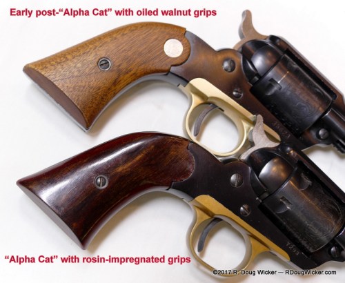 Here is a comparison of the rosin-impregnated rosewood grips originally used on the early Bearcat next to the oiled walnut grips with lightly stamped Ruger Eagle medallion that first appeared in 1964: