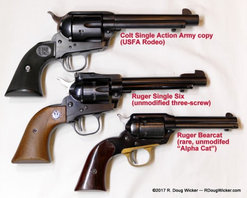 USFA Single Action Army; unmodified 3-screw Ruger Single Six; 1960 Ruger Bearcat