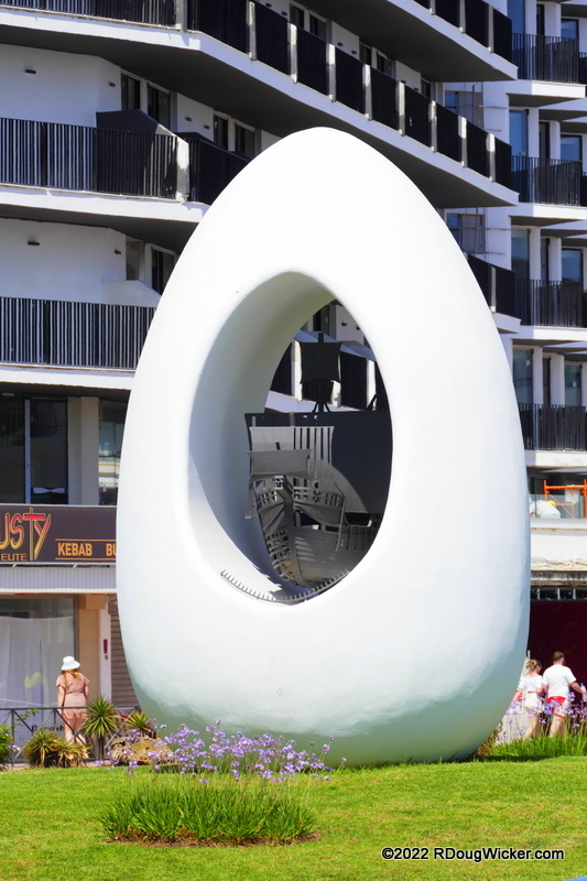 The beach is not without its amenities. On the left side of the photo above is a restaurant, and the large structure in the middle appears to be either a resort or an apartment complex. But behind where I stood taking the photo above is the town of Portiatx, where we found restaurants, cafés, a souvenir shop, and even a supermarket. We spent perhaps half an hour at this location, enjoying the views, getting refreshments, and visiting the loo. Then, it was back on the tour bus for a relatively short drive to our next destination and Ibiza’s second largest city, Sant Antoni de Portmany (Spanish: San Antonio Abad). Behold The Egg (Monument al Descobriment d’Amèrica — Monument to the Discovery of America):