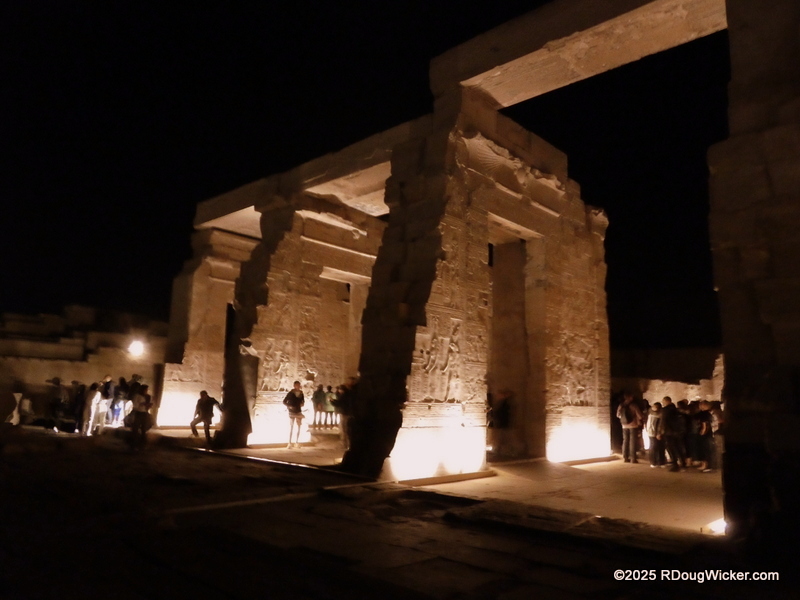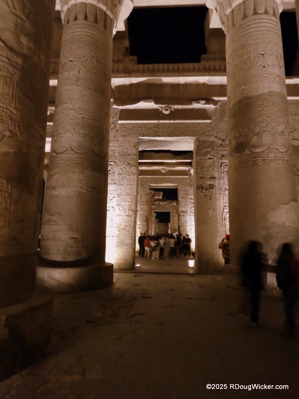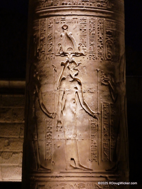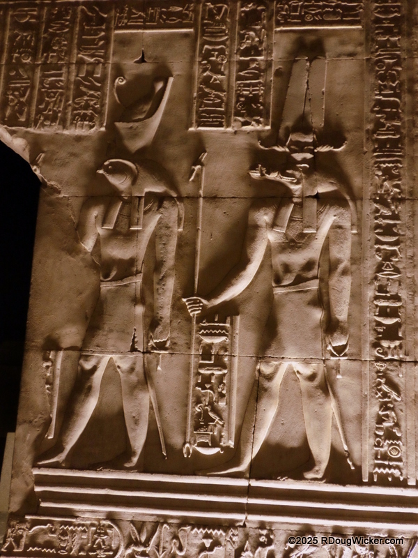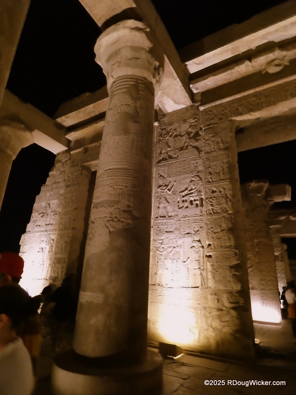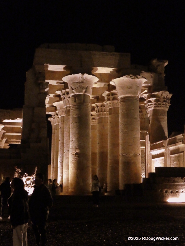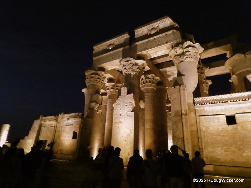 As you can probably tell from the past several weeks, so far it’s been a hectic, fun-filled two days. And this day in particular has been a long one with our ever-present travel companion/guide Mohamad Salah guiding the way. You may recall we began this day with an early morning car trip toward the Egypt-Sudan border to see Abu SImbel. We then made it back to Jaz Celebrity and set sail northward. Later that evening we arrived just as it was getting dark to our next sightseeing destination, the Temple of Kom Ombo. This is a rather unusual Egyptian antiquity, as it is two temple in one. One temple, the southern one, is dedicated to the Nile crocodile god Sobek, who also served as Egypt’s god of fertility.