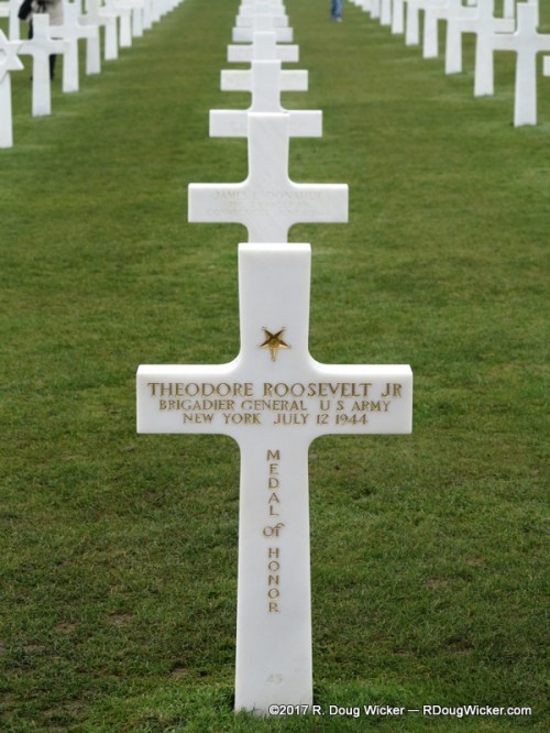 Below are a few more reminders of what we commemorate on this solemn occasion. Included in those photographs are the markers for Medal of Honor recipient Brigadier General Theodore “Ted” Roosevelt, Jr. who died just five weeks after he led the landing at Utah Beach, and his younger brother 2nd Lieutenant Quentin Roosevelt of the 95th Aero Squadron (Pursuit), who also fell on French soil just two days shy of twenty-six years earlier — during World War I. They are two brothers separated by two World Wars reunited a quarter century later in hallowed ground in Normandy, France.
