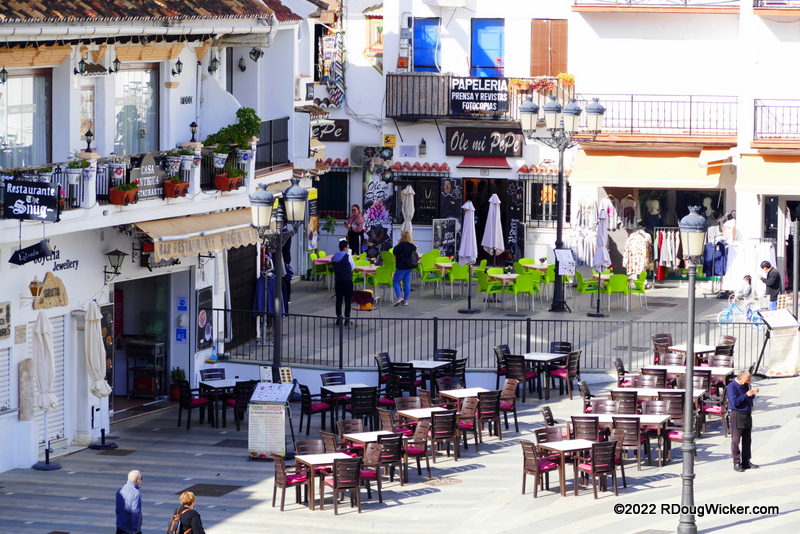 While Mijas is awash in whitewash, I’ve also mentioned that it’s walls are adorned with color everywhere you turn. Today we’re going to highlight the color by looking at the lush green spaces all over town. And while I mean for the most part vegetation when I mention green space, that’s not to say there aren’t splashes of manmade green as well. Take, for example, this splash of green at a typical Mijas café scene: