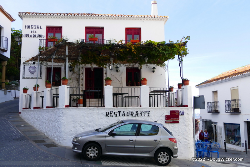 While Mijas is awash in whitewash, I’ve also mentioned that it’s walls are adorned with color everywhere you turn. Today we’re going to highlight the color by looking at the lush green spaces all over town. And while I mean for the most part vegetation when I mention green space, that’s not to say there aren’t splashes of manmade green as well. Take, for example, this splash of green at a typical Mijas café scene: