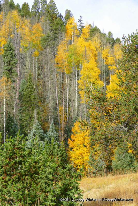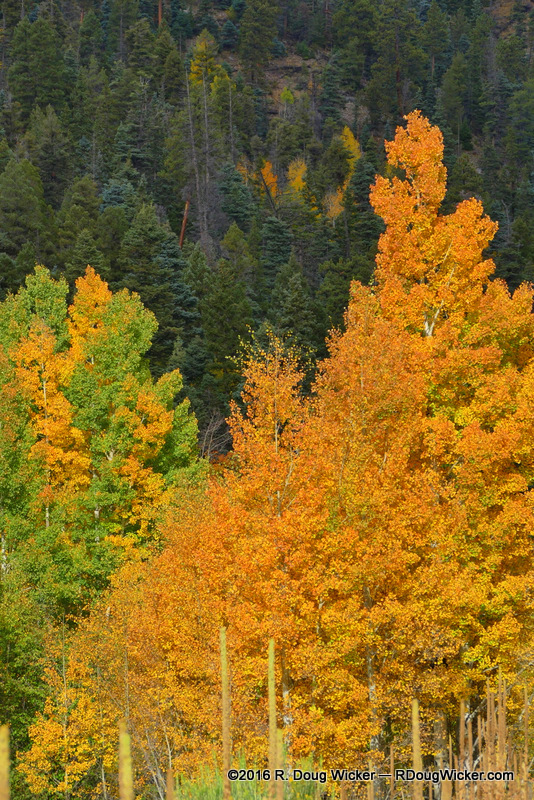 Most of the trees here in Carson are pine and fir, but hidden among these perpetually green conifers are deciduous trees covertly waiting for fall — mostly American aspen and gambel oak.  The color changes start out subtly, with dots of lighter greens and splashes of gold amongst a sea of forest green.