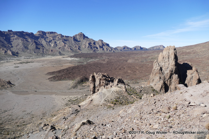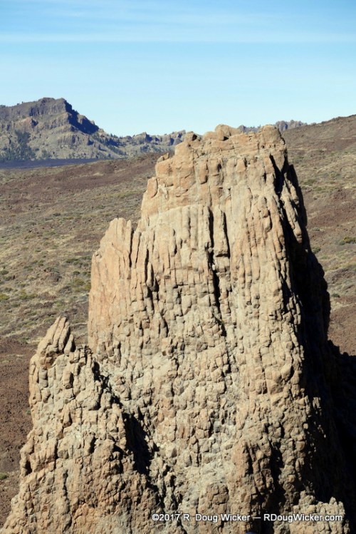 Near the vantage point inside the ancient lava field you can see a large, towering feature. This is La Catedral (The Cathedral). La Catedral is the remnants of a magma column once contained within a rising volcano. The slopes of the volcano have long sine eroded away, leaving behind the lava conduit you see on the right side of this image: