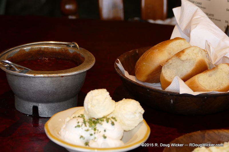 On this outing I opted for “The Cowgirl” — 1½ pounds/680 grams of T-bone purchased from El Paso-area ranchers.  Steak dinners here come with a choice of a baked potato, rice, or corn-on-the-cob.  Also accompanying your steak will be all-you-can-devour spicy ranch beans (and, boy, are they great), pineapple coleslaw (even better), and yeast roll breads (a tad commercial tasting in my book — definitely not homemade).