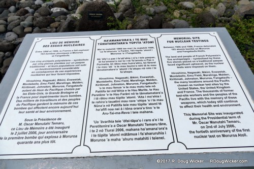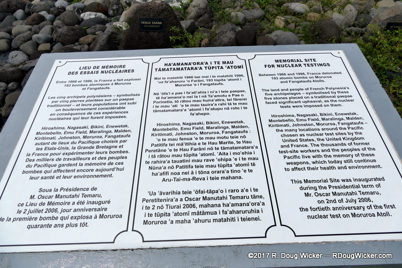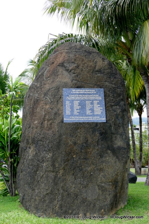 Hang a right onto Boulevard de la Reine Pōmare IV and within a very short walk you reach first Place Jacques Chirac and Pā’ōfa’i Gardens. Here you’ll see a couple of memorials. This is the memorial commemorating French nuclear testing on Moruroa, Fangataufa, and other Pacific atolls: