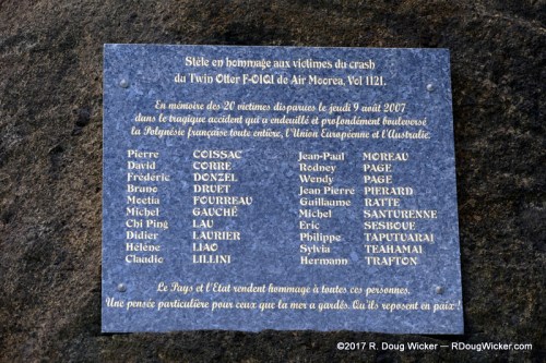 Another memorial commemorates the Air Mo’orea Flight 1121 tragedy that occurred August 9, 2007. The de Havilland of Canada DHC-6 Twin Otter crashed shortly after takeoff from Mo’orea, killing all twenty aboard.