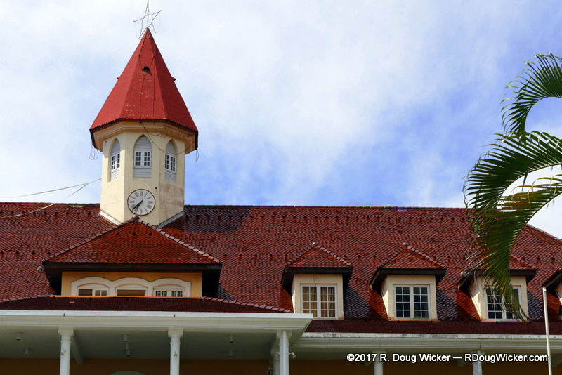 Walking the streets of Papeete affords the photographer with much to capture. The image above in the Mairie, or City Hall, and it was modeled after the old Royal Palace, which was demolished back in the 1960s. Here’s a close-up of the tiled roof, cupola, and colonial-style dormers: