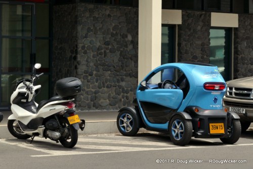 There were some pretty interesting automobiles about, as well. Here’s a car barely larger than the diminutive scooter parked alongside it: