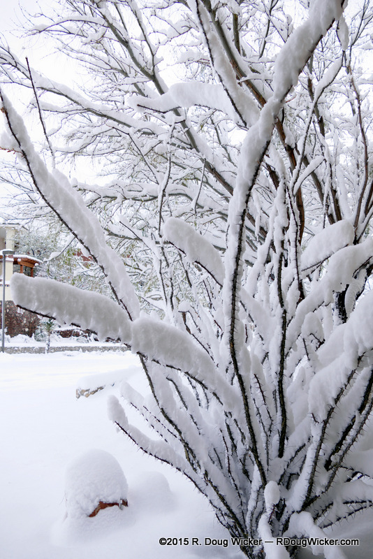 You may recall that I posted some hints on how to photograph snow in “Honey, why is the snow so gray . . . and your face so dark?” The trick, as you’ll recall, is primarily exposure compensation, and today’s photographs are no exception. These shots, both during the storm and later in bright sun conditions, were taken with a compensation of +1.3 stops to compensate for how snow tricks the camera’s built-in exposure metering.
