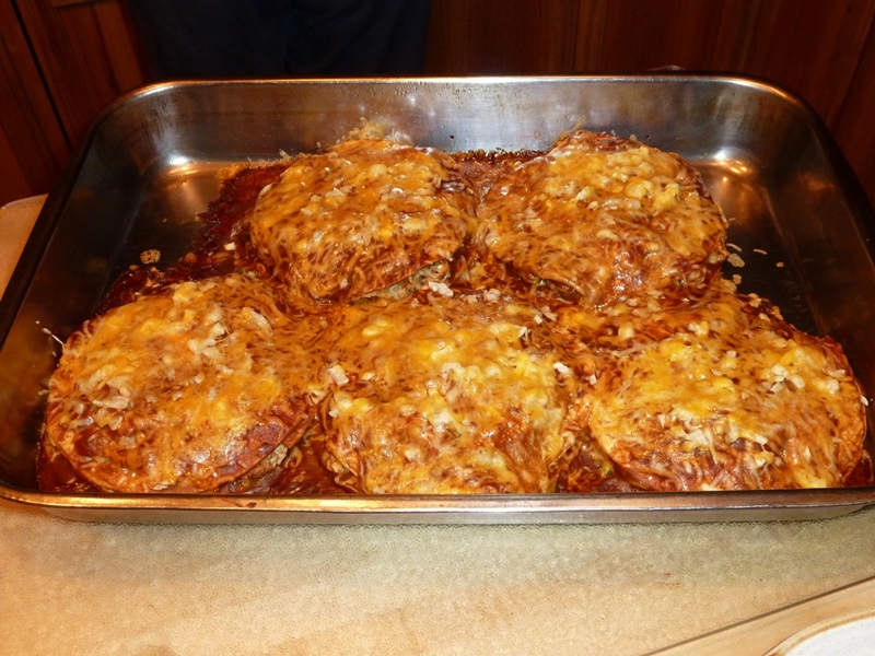 Bake at 375° (190° Celsius) for fifteen minutes or so, until the enchiladas are fully heated throughout, the cheese is completely melted, and the sauce steaming hot and almost bubbly.