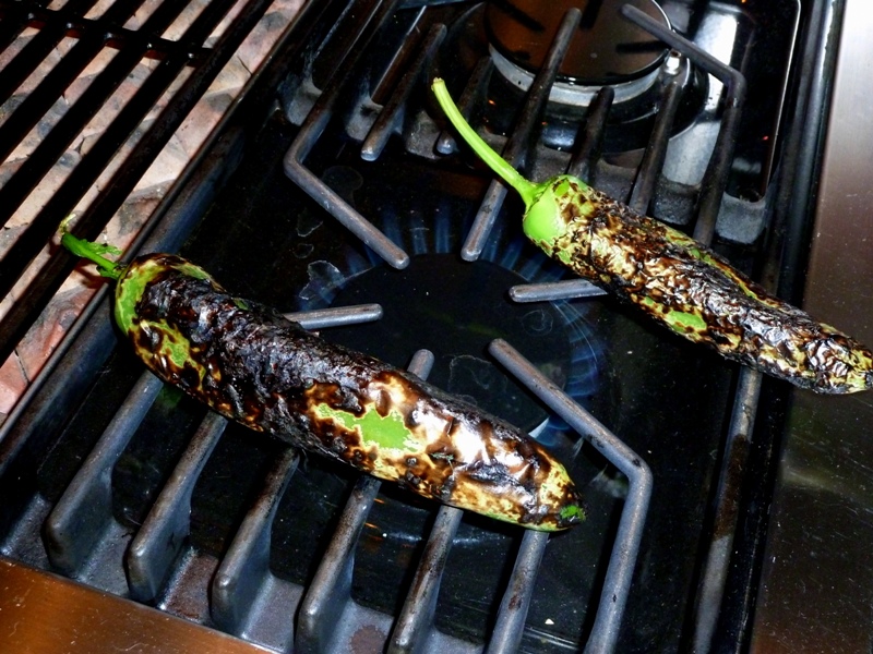 If you do decide to add green chile here’s a quick refresher on how to prep them (we did this before with Chile Rellenos). Roast the chiles over flame or hot charcoal until the skin is charred, but the flesh remains firm.