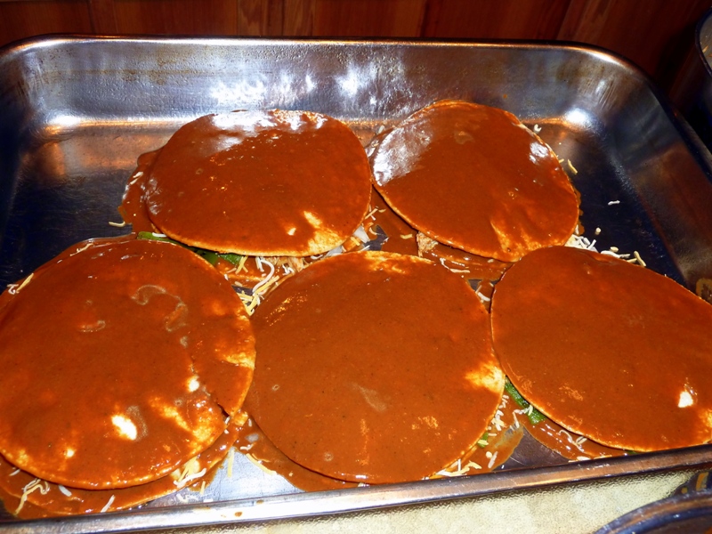 Most of you are probably familiar with the rolled red enchilada filled either with cheese or ground beef. Some of you may be familiar with rolled chicken enchiladas smothered in green chili sauce. But unless you’ve lived in the Southwestern U.S. or have spent any length of time in Mexico other than the usual tourist spots, chances are that you’ve yet to become acquainted with the flat enchilada — the Mexican answer to lasagna, in a sense. The advantage to the flat enchilada is primarily one of reduced calories and fat, since rolling a corn tortilla is hard to do unless the tortilla is first dipped in hot oil. As we’re not going to roll these enchiladas, there’s no reason to first dip the tortilla in all that fat.