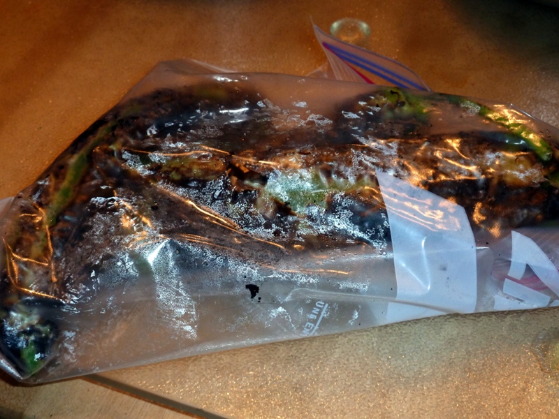 Steam the skins for easier removal by placing the still warm chiles into a plastic bag and leaving them to sweat for about five minutes.