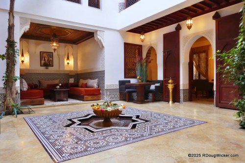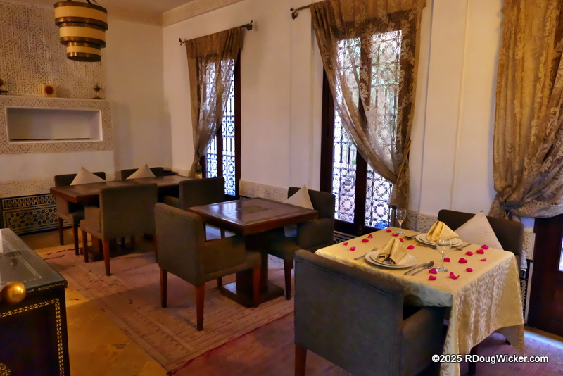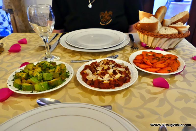 One of the things I’m just a tad bit wary of is eating in a location in which the tap water is not safe to drink. We once had an unbelievably bad experience the restaurant at a well-known, highly respected American chain hotel back in 1984 in Cairo. The culprit? The salad bar. Why? Because the produce was rinsed in local tap water. Three of the four of us had severe intestinal distress shortly thereafter. As we’d received the same tap water warning for Marrakech, I was a bit reluctant to eat out on the economy. Fortunately, we didn’t have to. Riad Viva supplied us nightly with an ever-changing daily set menu of traditional Moroccan food. We kept going back each and every night. But be forewarned. You must pay in advance, with cash, at least several hours beforehand, and you won’t really know what the courses are until after you are seated.