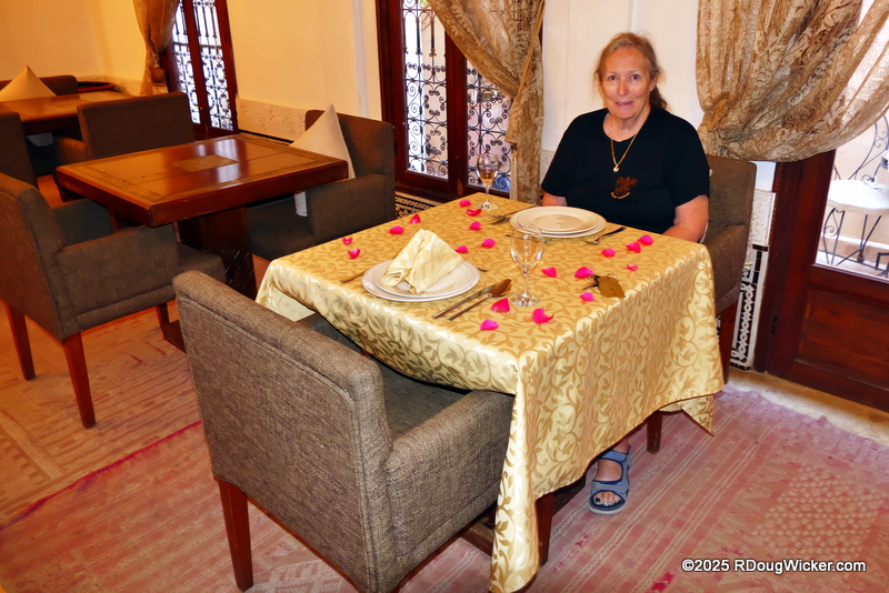 Upon entering the dining room our table awaited. The place settings rested upon an elegant tablecloth strewn with fresh rose petals. Here’s Ursula waiting to find out what Moroccan delights would soon arrive: