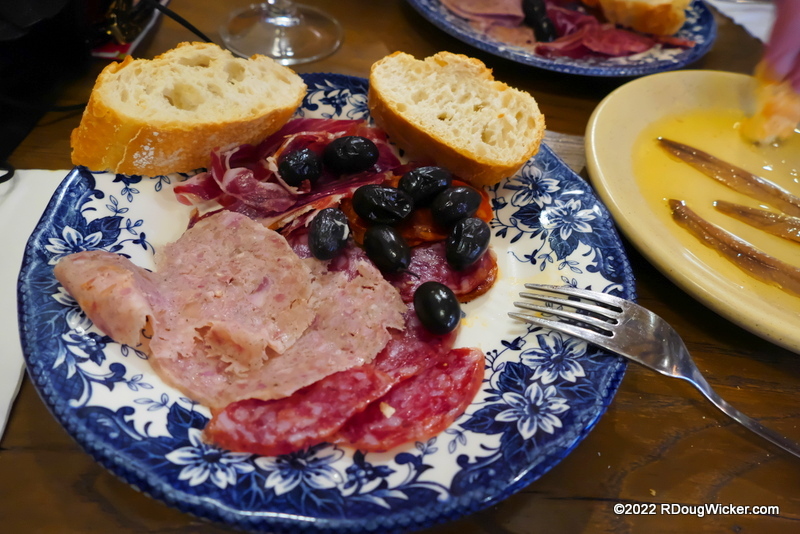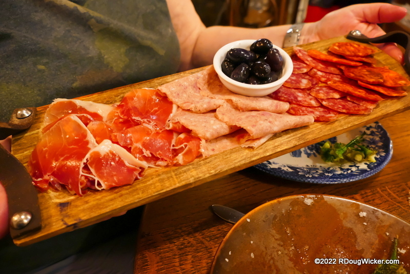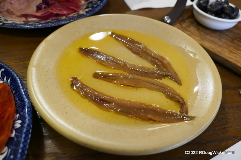 One quibble I might have is that bread comes as a separate expense at Restaurante Anduriña, but Ursula and I remain willing to overlook that because everything else is so yummy and relatively affordable. One item that remains a constant on this visit as well as our previous three last October is the Spanish cured meat platter. From my previous review: “Let’s zoom in and see what goodies await, as this platter includes olives, chorizo (a spicy sausage), Iberian ham, fuet (a thinly sliced dry-cured pork sausage), bull blanc (the pale meat pictured, a type of pork sausage).” That, too, is just as good as it was before, and the price for this wonderful tray is only €2 more than it was last year: