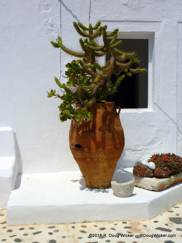 The whitewashed buildings of Santorini offer up a great background even for duller colored subjects, such as this potted cactus: