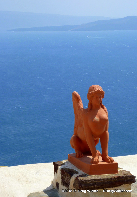 Below is an image I captured of a Greek Sphinx against the blue backdrop of the Aegean inside the Santorini caldera. The Greek version of this mythical beast retains the human head atop a lion’s body of its Egyptian counterpart, but you’ll note that this version includes female breasts, the wings of an eagle, and not visible in this photo, a tail consisting of a serpent: