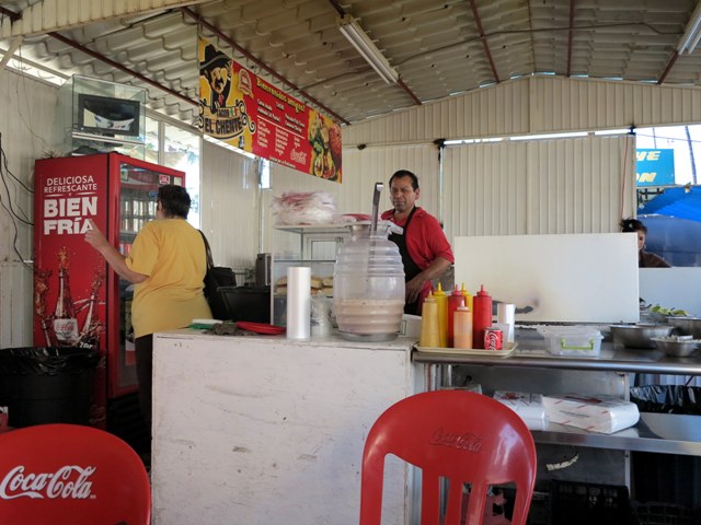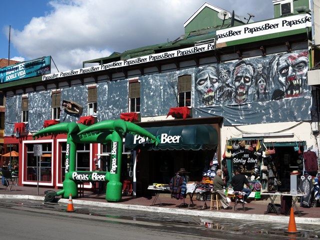 On the upside are the street food vendors. You’ll see in today’s pictures just such an example, where Ursula and I partook of some fish tacos and orange Fanta. Also fun are the brightly colored buildings that range from obnoxious Barbie pink to lemon chiffon and even lime sherbet chartreuse.
