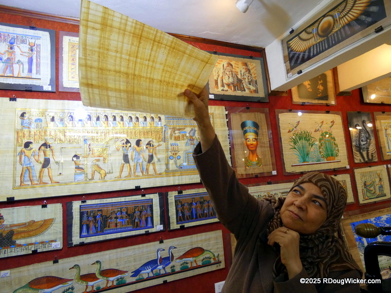 Before that, however, we actually had a fun visit with at a papyrus art shop. This is the Egypt Papyrus Museum and it’s not an actual museum, but rather a nice store. Here the proprietors actually make their own papyrus paper by hand. First, our demonstrator took water-soaked stems from the papyrus plant and rolled them out:
