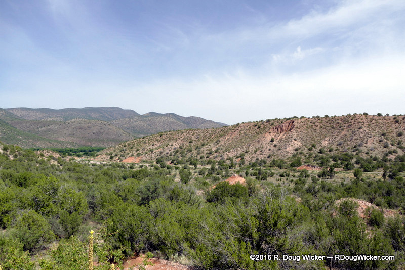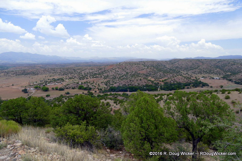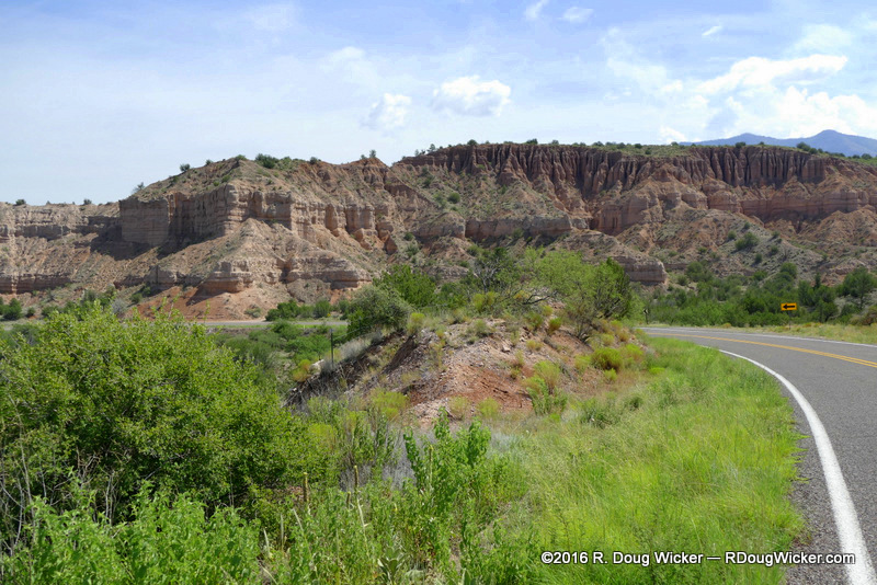 From U.S. 180 you turn right and head eastbound on New Mexico State Road 174 (NM 174 on maps) north of Buckhorn, Pleasanton, and Glenwood. Before we take that turn I’m going to bring you on a slight detour to the north. The New Mexico ghost mining town of Mogollon along Bursum Road/NM 159. Mogollon is now privately owned and up for tourism, but the road there is not exactly sedan friendly. We turned back before we reached there because of a combination of narrow, pitted roads more suitable for four-wheel drive and an approaching thunderstorm that would later that day threaten our safe return to Silver City. Indeed, had we persevered we would have later been caught in some very serious flooding. At any rate, coming back down the hill on NM 159 afforded us some very special views of the valley below.