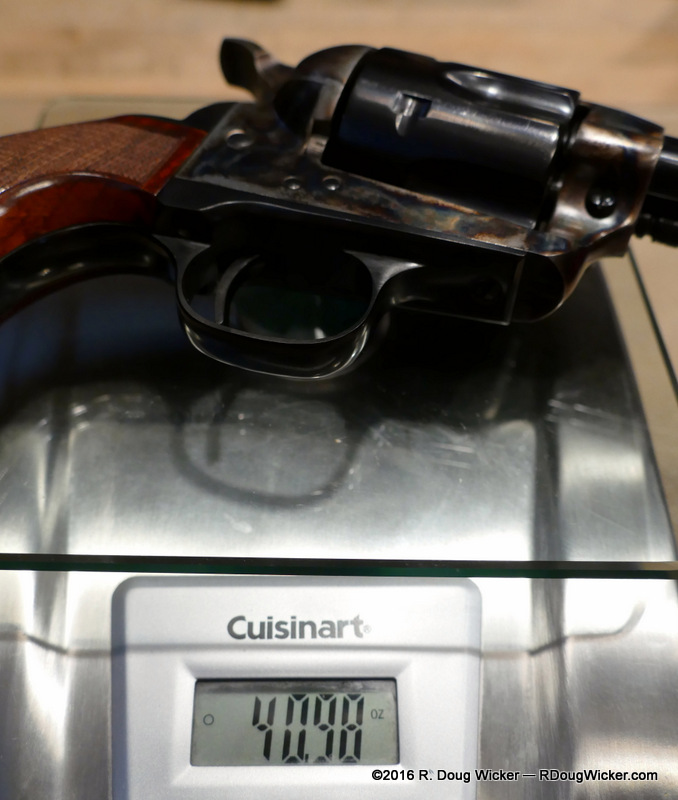 Now this next comparison is a bit of a shocker. As tight and solid as the U.S.F.A. Rodeo feels in hand, it actually weighs in at nearly three ounces less than Uberti’s offering — 2.82 counces/80 grams less, to be precise. It could be that the added weight on the Uberti results from beefing up both frame and cylinder to handle the higher pressures of the .357 Magnum round, or it could be the Uberti’s wood grips come at a weight premium over the U.S.F.A.’s rubber, but those are just guesses on my part.