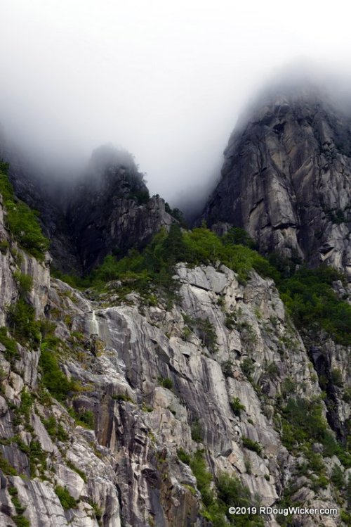 The muted grays of the sky and the cliffs stood in stark contrast to the bright green foliage: