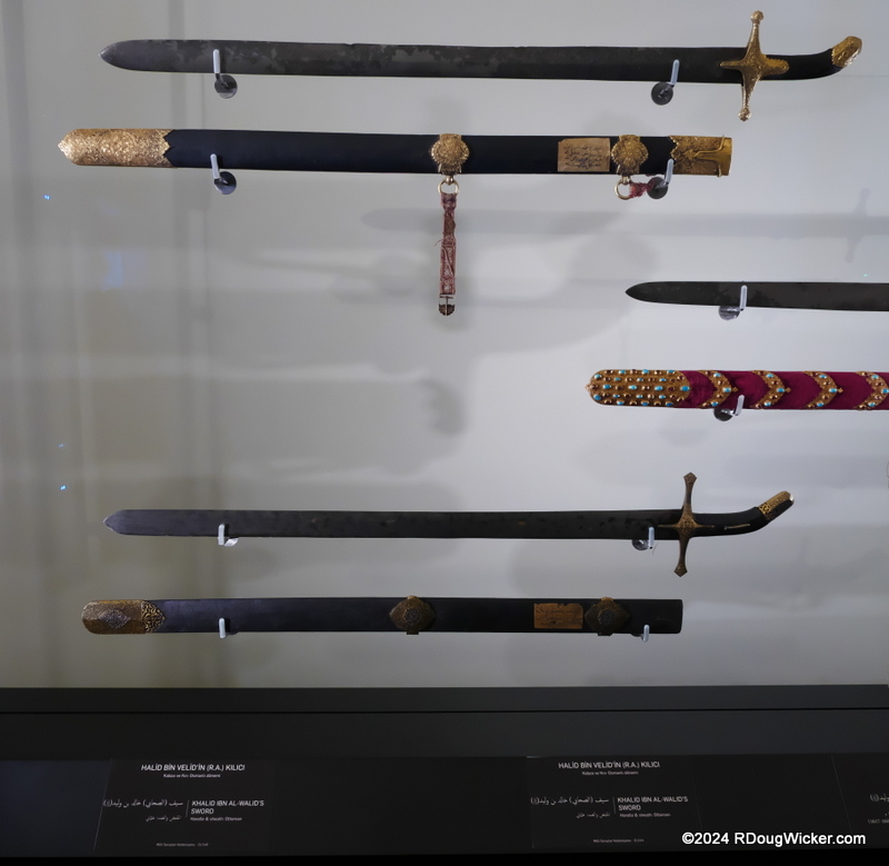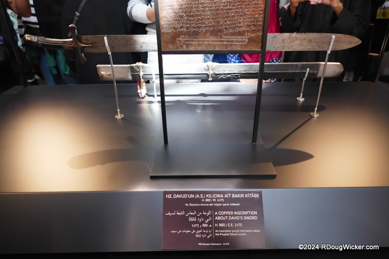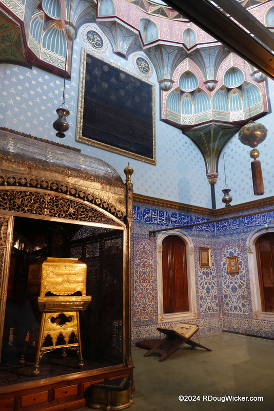 Today we’re still in the Chamber of Sacred Relics in the Topkapi Palace, Istanbul, Türkiye (formerly Turkey). Whereas on Monday I concentrated on objects more closely associated with the Prophet Muhammad, today I’m going to get a bit more diverse starting with two items linked to David. But first, let’s look around at the impressive interior of what used to serve as the Privy Chamber before it became home to the Sacred Relics. Note the high domes, vaulted ceilings, and intricate and colorful tiles: