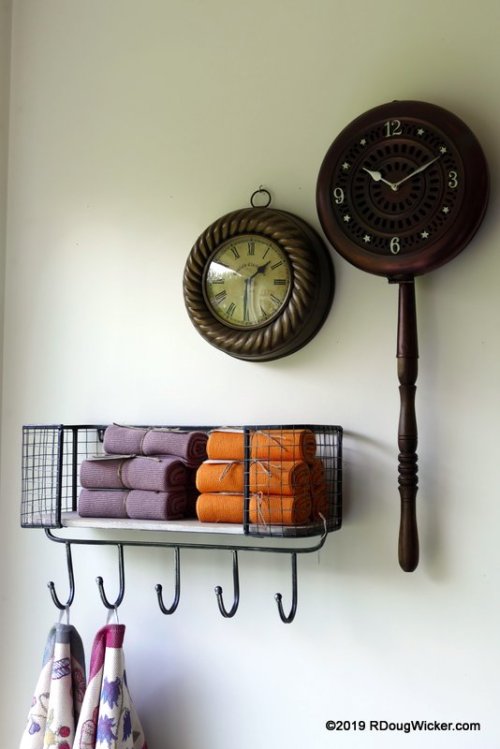 Here is an interesting clock made from a bed warmer, as well as other wall knickknacks: