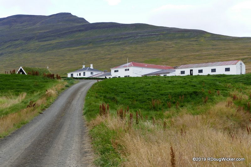 Saurbæjarkirkja appears to be situated on farmland, as it sits mere meters away from this farm house and associated structures:
