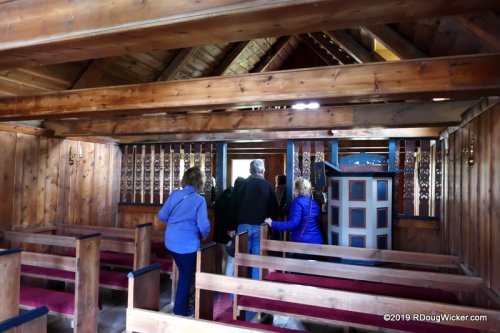 The church interior is rustic, with a lot of rich wood. But pay particular attention to the detail in the wooden ceiling holding up the turf roof: