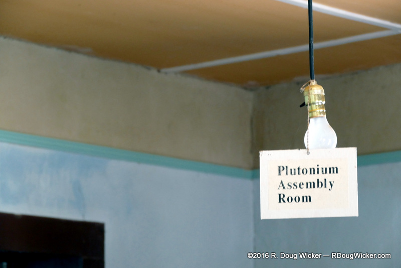 This plutonium assembly room was previously the master bedroom of the house.  Workbenches were brought in.  The former bedroom was meticulously cleaned, and then sealed off with plastic and tape to prevent dust contamination.  Signs were posted admonishing all who entered to wipe off their shoes.