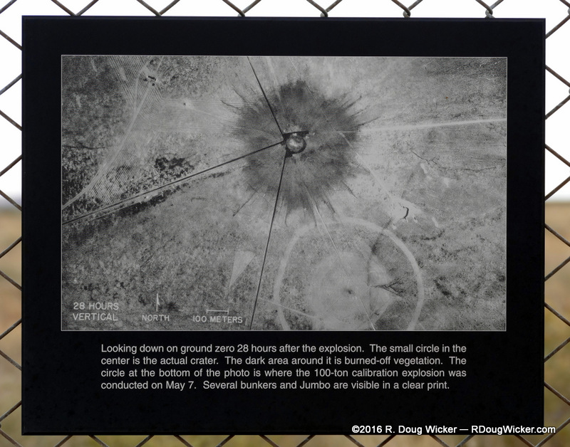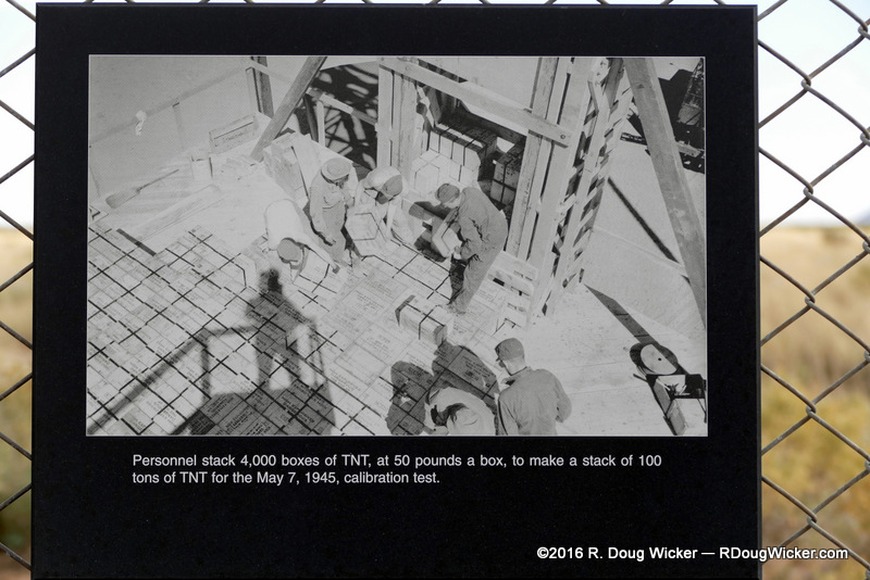 You’ll notice visitors strolling around the perimeter fence. They’re perusing small photo plaques describing the events leading up to the Trinity explosion and what occurred here that day. I’ll be presenting to you photos of these plaques on Friday and next Monday. The buses in the background of the below photograph transport visitors to the nearby McDonald Ranch, which you’ll get to see in next Wednesday’s blog post.