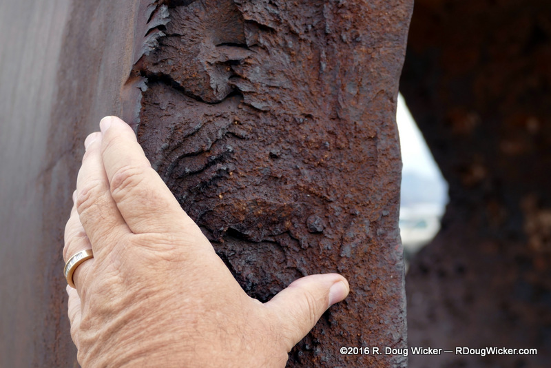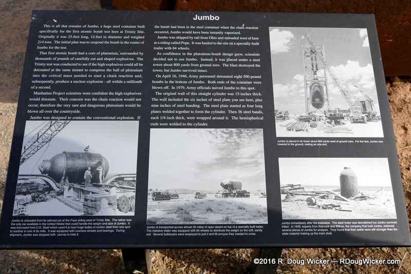 You’ll know when you get to Ground Zero at Trinity Site. It’s marked by the twelve-foot tall lava rock obelisk you see above. The Gadget was hoisted atop a 100-foot/30-meter “shot tower” above this precise location for the July 16, 1945 test. The Gadget was a plutonium device that was the basis for the Fat Man device dropped on Nagasaki, Japan on August 9, 1945. There’s even a replica of Fat Man onsite:
